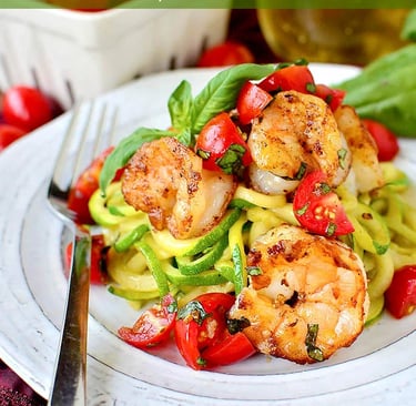 1 tbsp olive oil • 8 oz shrimp, peeled/deveined • 2 zucchini, spiralized • 1 cup cherry tomatoes, halved • 2 cloves garlic, minced • Salt, pepper, chili flakes • Fresh basil or lemon