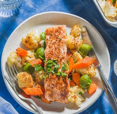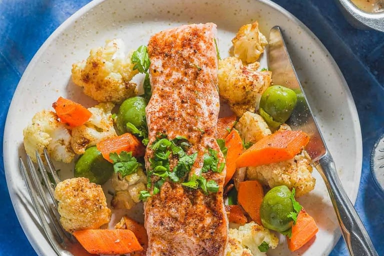 🥣 5. Salmon with Roasted Veggies (~390 Calories)